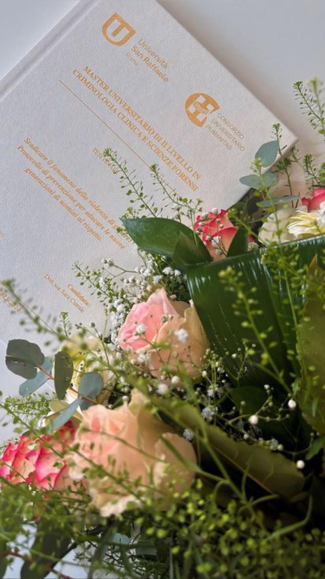 Nel 2024 ho continuato i miei studi e conseguito un master universitario di II livello in Criminologia clinica e scienze forensi all'Università San Raffaele di Roma, con una tesi dal titolo "Sradicare il fenomeno della violenza di genere: Protocollo di prevenzione per educare le nuove generazioni di uomini al rispetto", da cui ho iniziato l'omonino progetto di ricerca, che è tutt'oggi in lavorazione e potrebbe portare a grandi cambiamenti nel panorama italiano riguardo alla violenza di genere.